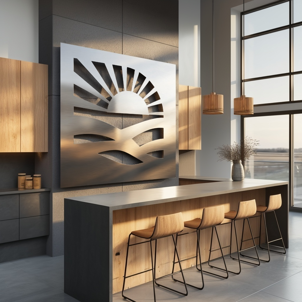 Radiating beams rise from a smooth horizon line, meeting a series of flowing cuts that echo the shape of shifting terrain. The Dawn brings light and landscape into a unified composition, using crisp geometry and open negative space to create a modern emblem of renewal and ascent.