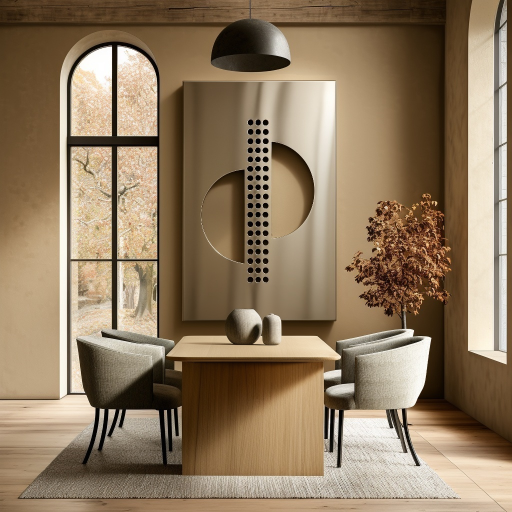 A vertical column of precise perforations cuts through a pair of balanced circular forms to create a composition that feels intentional and architectural. The Sequence carries a sense of measured cadence, a modern study in repetition and contrast shaped through clean geometry and open negative space.